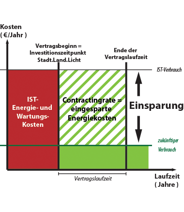 Die Gemeinden schließen mit Stadt.Land.Licht einen Vertrag, über dessen Dauer die bisherigen Aufwendungen für Strom und Instandhaltung weiterhin gezahlt werden. Aus der Differenz zwischen diesen Aufwendungen und den realen Kosten finanziert Stadt.Land.Licht die eingesetzte Investitionssumme